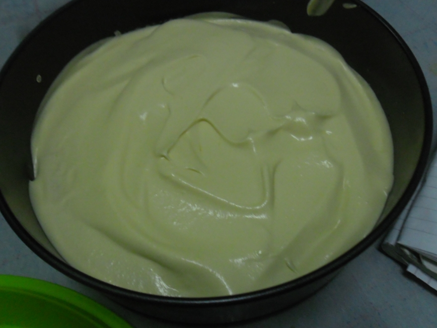 Pastu tuangkn adunan mango mousse di atasnya & di tepi2 kek & ratakan.
